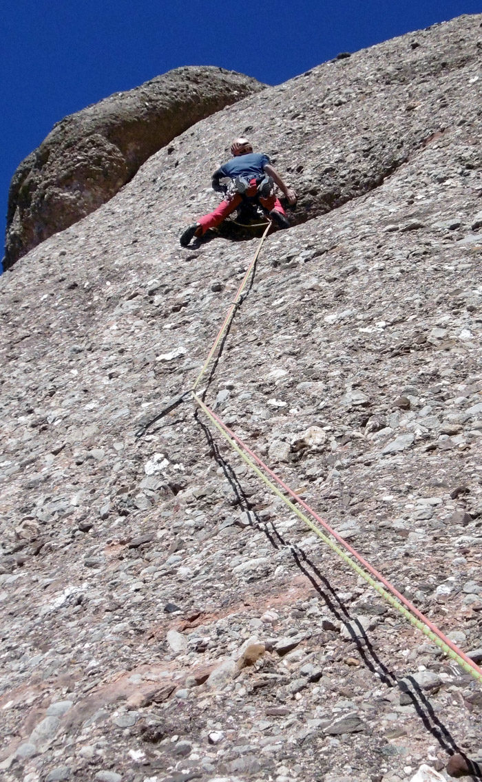 De la poca gent que conec que hagi repetit aquesta via només en sé d’un que no hagi sortit cantant el colacao… Nosaltres no en som l’excepció. I és que no val a refiar-se d’una ressenya que no passa de V i d’algunes cites a les guies que qualifiquen la roca d’envejable. Res més lluny de la realitat: és la roca típica de Frares, còdol petit i trencadís, potser per la poca freqüentació. Si a això li sumem una escalada d’allò més fina i on el terme expo pren tot el seu sentit ens trobem davant una ruta gens banal.
