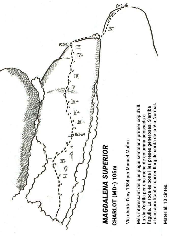 La via es troba totalment equipada, de fet va ser re-equipada l’any 2012. Nosaltres hem fet la via en qüestió en dos llargs de corda, més una darrera tirada per guanyar el cim de la Magdalena Superior. Així queda una via ben ràpida, amb roca molt bon (malgrat les aparences) i amb una orientació que permet escalar a l’ombra escollint bé l’horari.