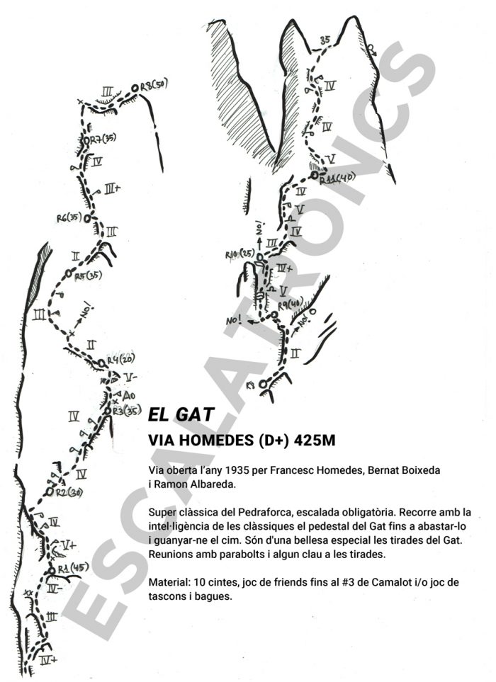 L‘Homedes és una de les escalades més paradigmàtiques del Pedraforca. Oberta l’any 1935, devia ser tota una aventura, amb un final més que tràgic. Avui en dia és una de les vies més sol·licitades del Pedraforca, amb un traçat ben elegant per lògic, trobant en tot moment per allà on s’ha d’anar, enfilant-se al capdamunt d’aquest apocat gat de pedra, que treu les orelles entre Cabirols Superior i el Calderer.
