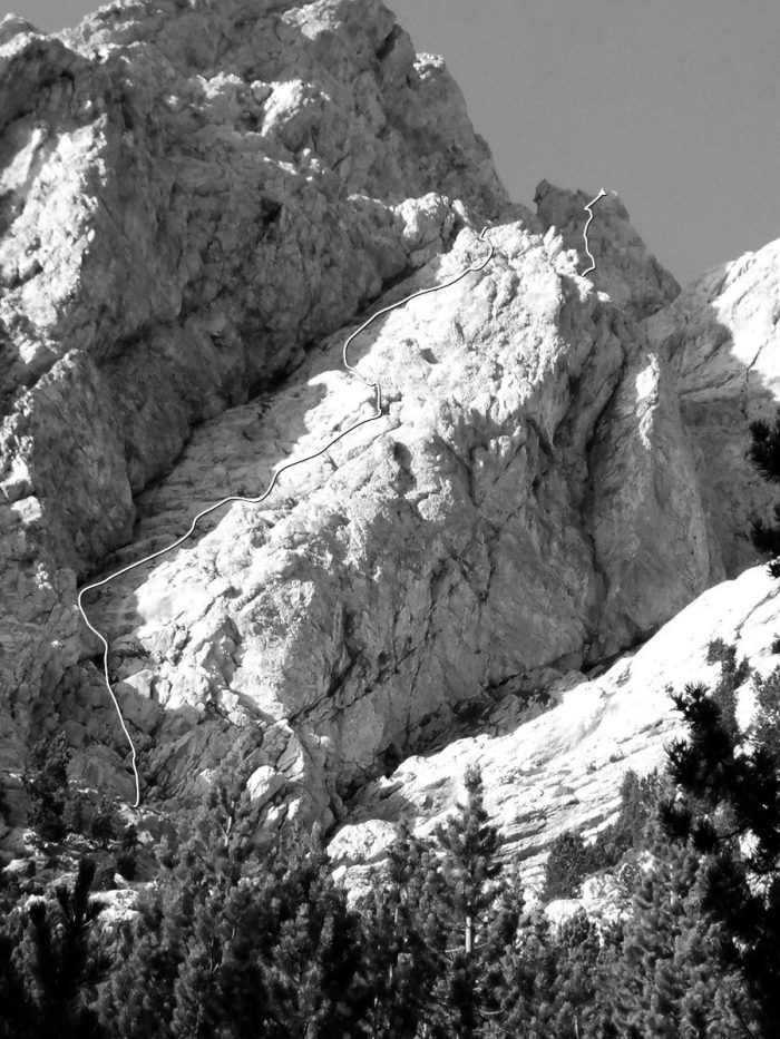 De caràcter alpí, la via segueix la lògica del sector, zigzaguejant per allà on la paret es deixa. La part central (de l’R4 a l’R7) es pot fer tranquil·lament a l’ensamble.