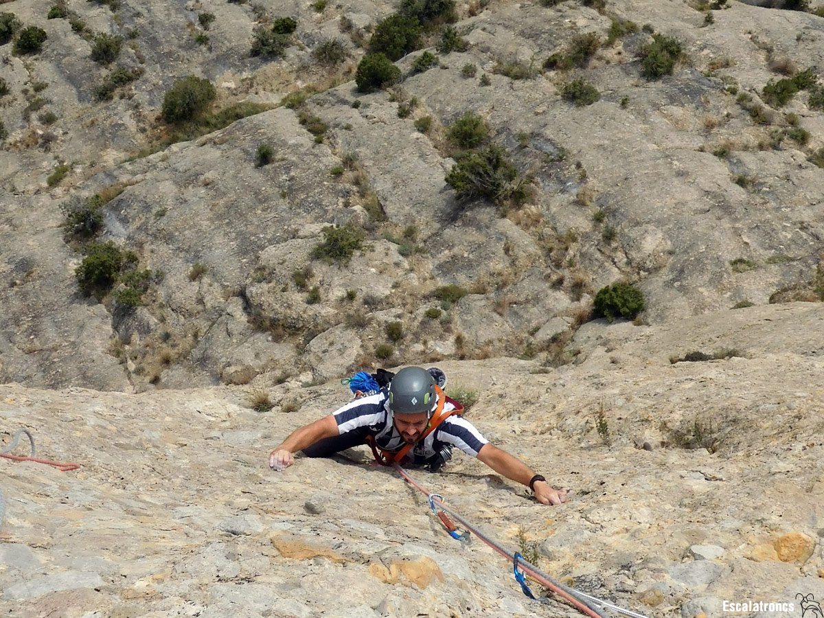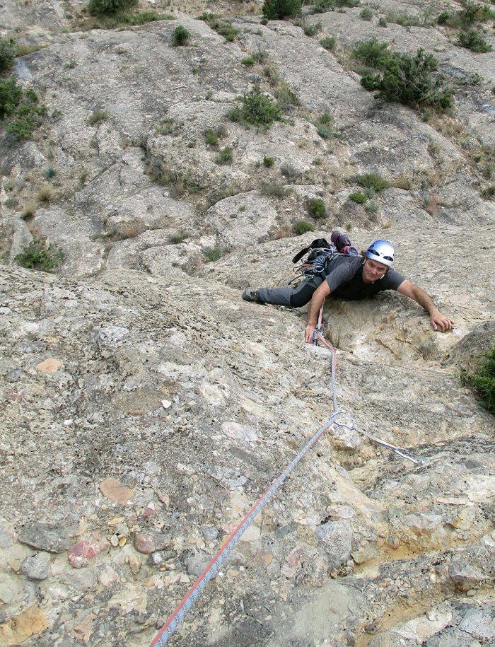 Com hem comentat a l’inici la via es divideix en dues parts del tot diferents. La primera, per abastar la feixa que talla la paret per la meitat, és fàcil, amb roca correcta i si no sanejada. Per contra, el mur final, de naturalesa monolítica està obert a cop d’expansió. Això permet forçar en lliure tant com vulguem o guanyar la part més severa amb un agradable Ae. El darrer llarg de corda té dues sortides, recomanem marxar cap a l’esquerra, on sortirem al cim per un curiós forat.