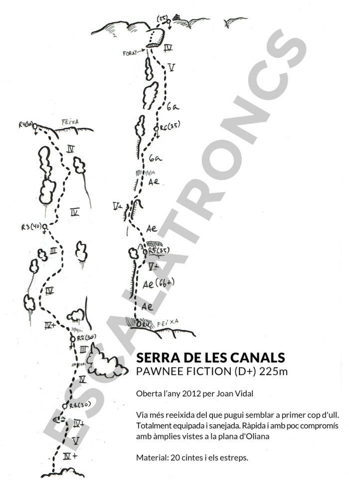 La Pawnee Fiction pren la filosofia de la seva veïna “Sol de Mitjanit” i s’enfila de manera directa a aquesta discreta muralla que és la Serra dels Canals. Per fer-ho guanya primer la zona inclinada amb 4 llargs de corda fàcils i amb roca més compacta del que hom pugui imaginar. La segona part de la via, per contra, ataca el mur somital sense miraments a cop d’expansió, fet que permet anar forçant al gust del personal. La jugada queda rematada per una darrera tirada de roca bona i final sorprenent.
