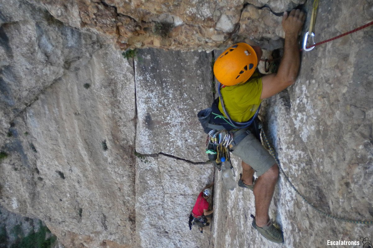 Tirada de tràmit per anar a buscar la placa final. De la reunió superem un petit ressalt i flanquegem a l’esquerra fins trobar la cinquena reunió. 25 metres, un pont de roca i un clau.