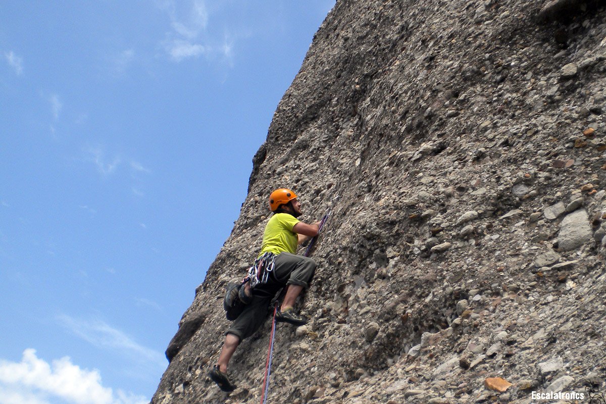 Anem a buscar el mur que ens queda davant. L’escalada esdevé vertical i tècnica, sobre presa petita; trobem la màxima dificultat a meitat de la tirada on hi ha un curt tram que es balma lleugerament. Un cop superat encara resten uns pocs metres verticals fins que la paret es rendeix. La tirada és difícil però gens obligada. 20 metres, 6 espits.