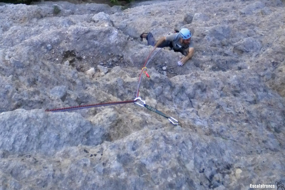 Sortim caminant per la vira fins situar-nos a l’alçada d’una fissura diagonal que anem resseguint. Quan aquesta s’acaba tirem recte amunt fins atènyer la quarta reunió. 30 metres.