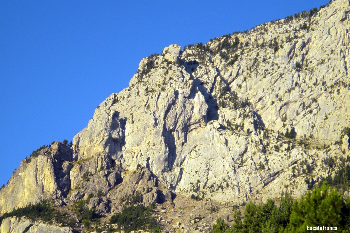 Sortim de la reunió flanquejant cap a l’esquerra seguint una fissura, per al cap d’uns metres fer una diagonal cap a la dreta, pel camí trobarem un petit pi. El terreny és vertical, l’ambient sensacional i l’escalada esdevé variada, amb passos d’adherència, curtes bavareses i moviments atlètics sobre franques preses. 4 expansions i 3 claus, 35 metres.