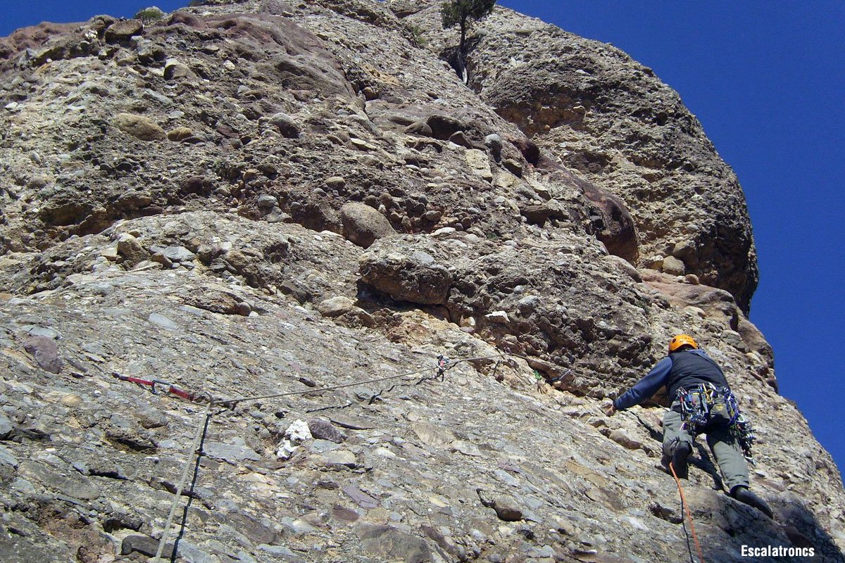 Al transcorre per la fissura tindrem bones possibilitats d’auto-protegir-nos sense problemes. El rocam, tot i no tenir un aspecte gaire engrescador és prou acceptable. 35 metres, 3 burins, 3 claus i un pont de roca.