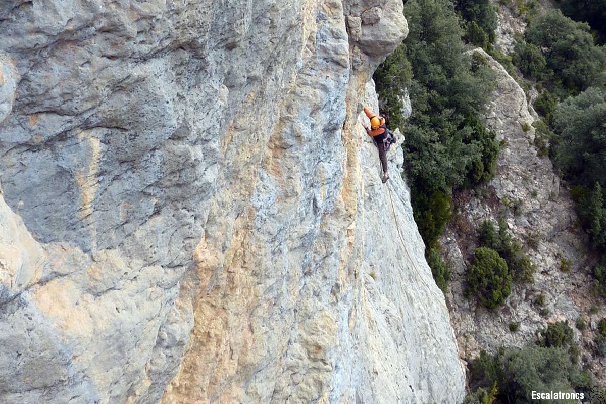 La morfologia de la roca ha canviat definitivament i aquí les preses són més arrodonides i ens obliguen a anar fent ziga-zagues a la cerca de la millor opció. El pas clau es troba entre la penúltima i la darrera xapa, on haurem d’anar lleugerament a l’esquerra per després tornar a la dreta per encintar l’última expansió. 20 metres.