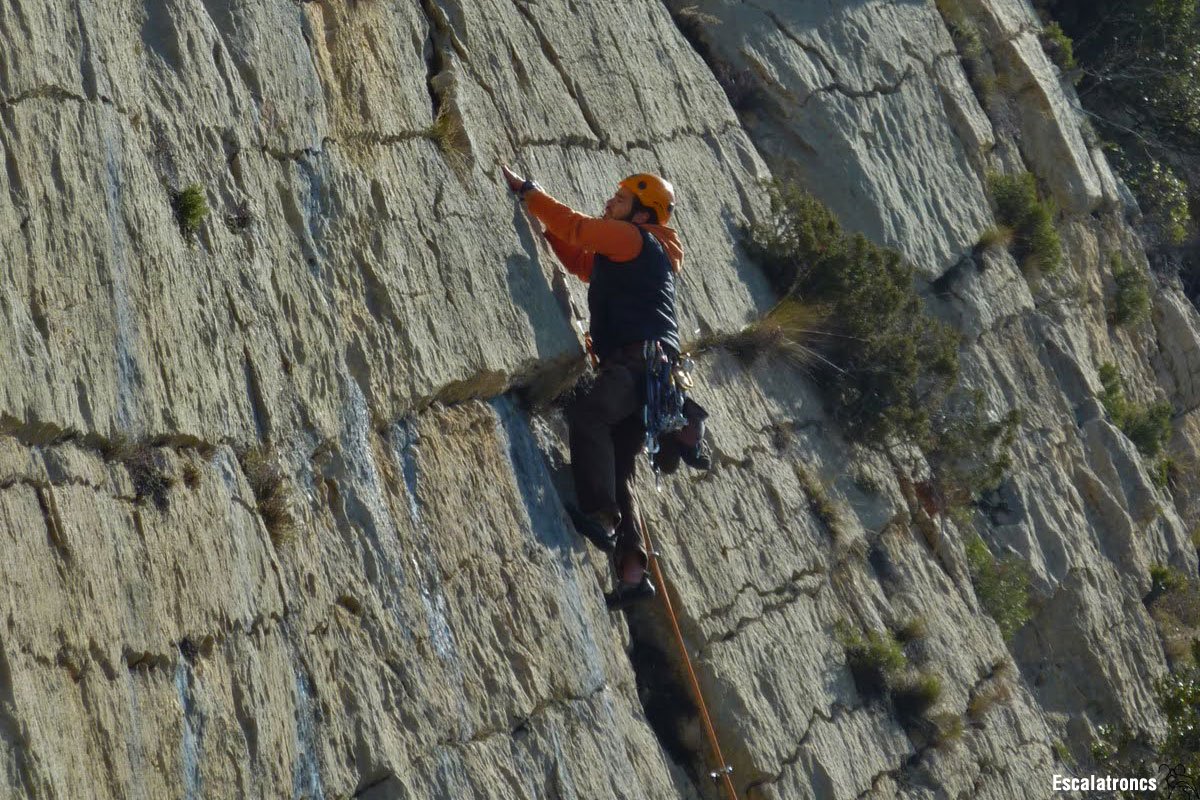 Iniciem la tirada fent una diagonal fins la primera expansió; després recte amunt fins trobar dos escarpies juntes a l’inici d’una fissura. Trobem una altra escarpia que protegeix un pas una mica estrany que ens permet arribar a una nova expansió. A partir d’aquest punt obliqüem cap a l’esquerra amb bon ambient fins que quedem a l’esquerra del sostre. El superem per la part més dèbil amb uns moviments atlètics sobre bones nanses i ja quedem col·locats en terreny ,és fàcil, però alhora més trencat. Ens resten uns metres fàcils fins la tercera reunió que queda a la dreta. 40 metres.