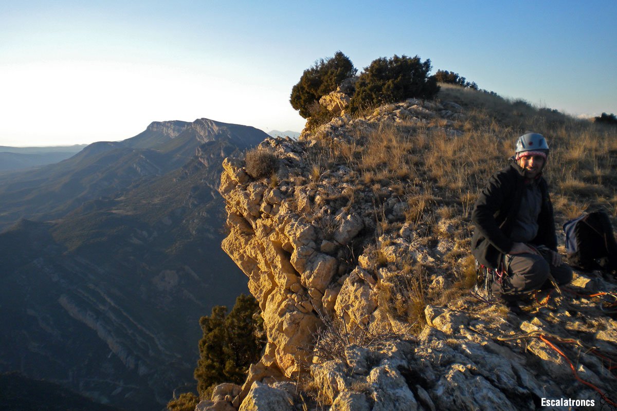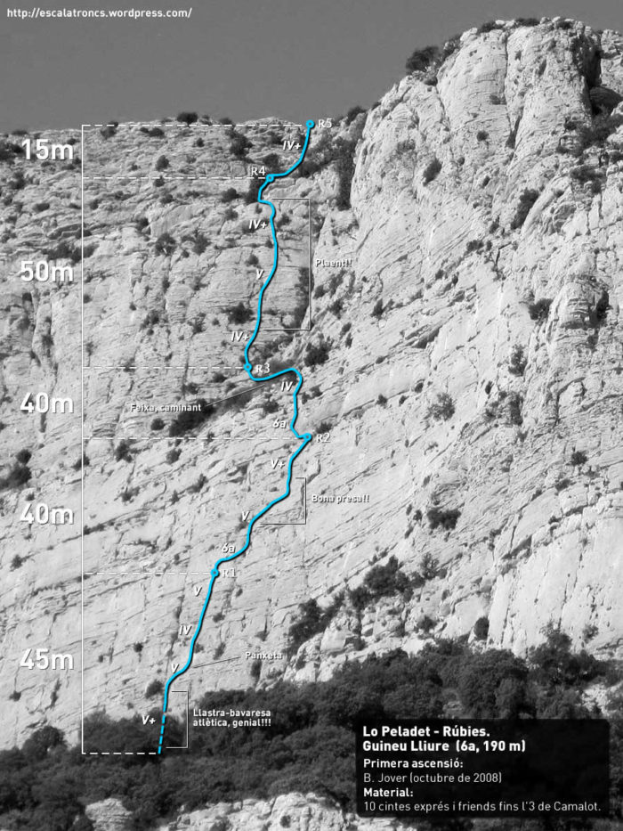 Sortim de la reunió recte amunt a caçar la primera expansió. El tram clau es troba entre aquest primer parabolt i el següent, amb una escalada vertical on haurem de llegir el millor camí, que no sempre és la línia recta. Una mica més amunt trobarem un clau, superem una panxa i una expansió, a partir de la qual obliqüem cap a la dreta per una placa amb bones gandes que ens mena a un nou clau. A partir d’aquí, cop de gas amunt fins una savineta i d’allí fàcil fins la role. 40 metres.