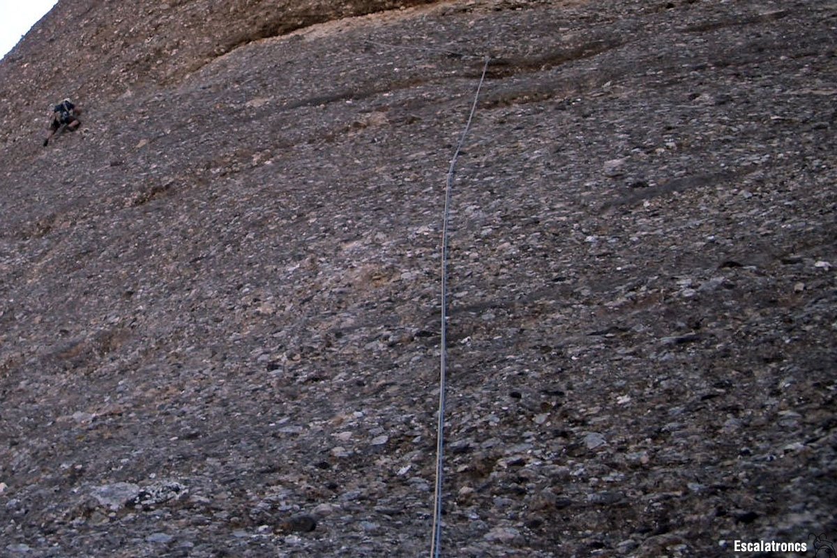 Iniciem la segona tirada recte amunt per terreny molt vertical, amb bona presa i ben protegit, fet que permet passar en lliure (6a) o en A0. Un cop xapat el segon parabolt marxem en diagonal cap a l’esquerra amb uns passos de finura fins abastar el següent parabolt. Seguim flanquejant cap a l’esquerra fins situar-nos al costat d’una balma, on podrem aprofitar un espit de la ‘Via del Jan’. A partir d’aquest punt tirem recte amunt, navegant per una preciosa placa. Pel camí trobarem un parell d’expansions més i podrem col·locar un Camalot #00. Un cop a l’alçada del segon parabolt d’aquest tram iniciem una diagonal cap a la dreta que ens durà directament a la segona reunió. 35 metres, sis parabolts, un espit i un burí. Reunió d’un espit, un bolt i burins.