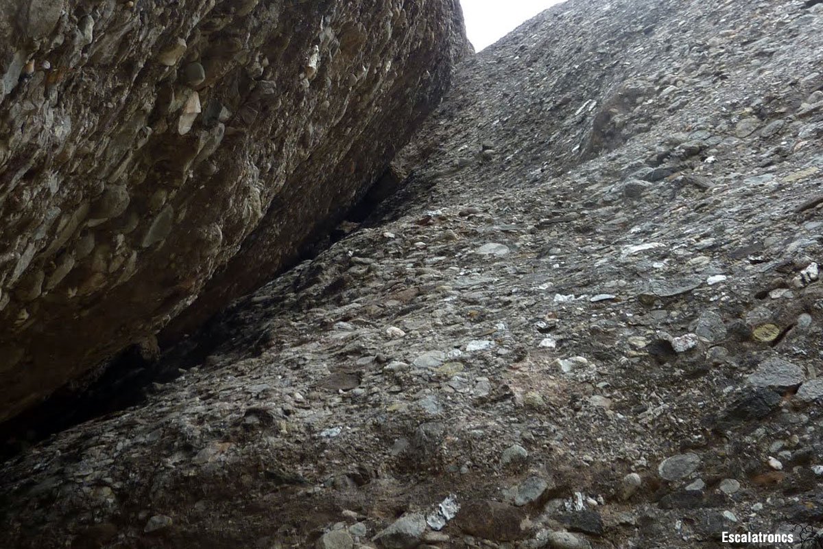 La segona tirada és un llarg extraordinari. Pugem un metre per la placa i encastem mig cos a la xemeneia, d’aquesta manera superem els primers metres que són els menys fàcils. De seguida que puguem hem d’entrar a la xemeneia, però mai massa endins. Progressarem en tècnica de ramonage gens angoixant.