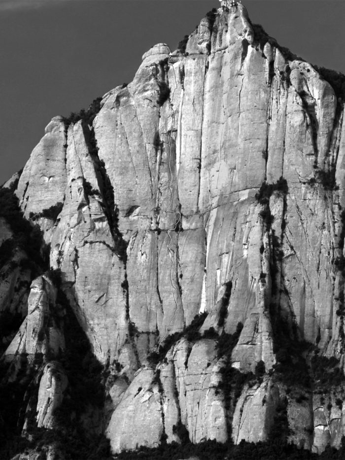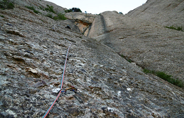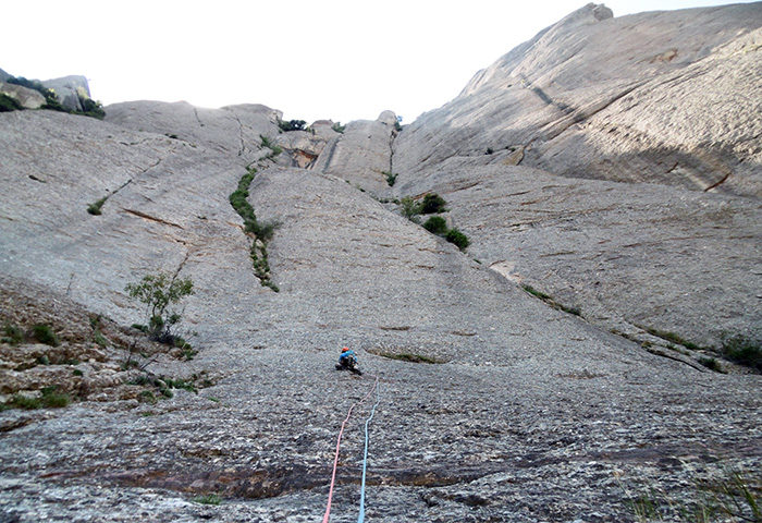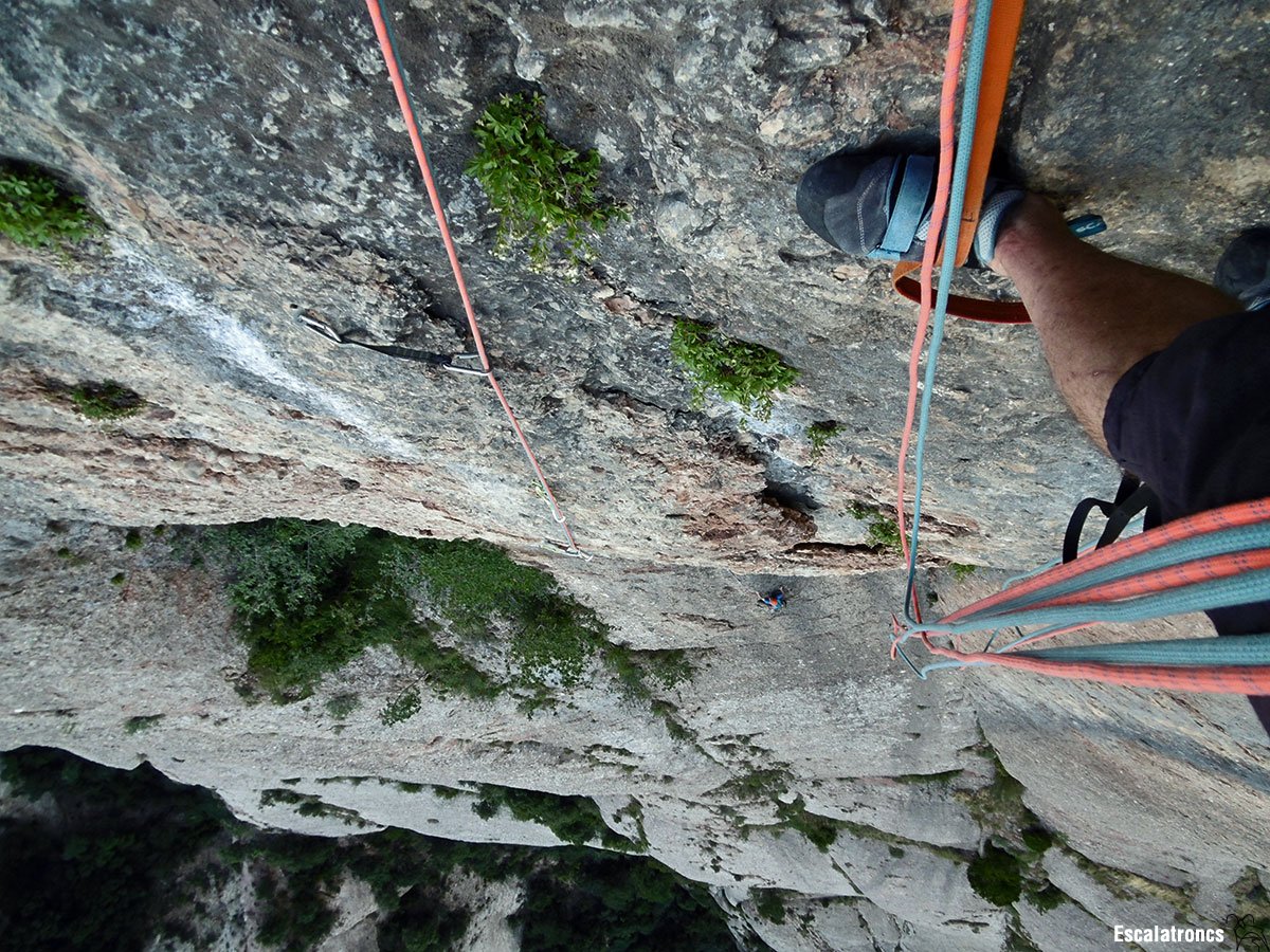 La via es troba completament equipada amb espits, alguns una mica justos, però avui en dia tampoc hem tingut la sensació que hi hagi cap de terminal. Hem empalmat la tercera i la quarta tirada (55 metres) i la setena i la vuitena (55 metres).