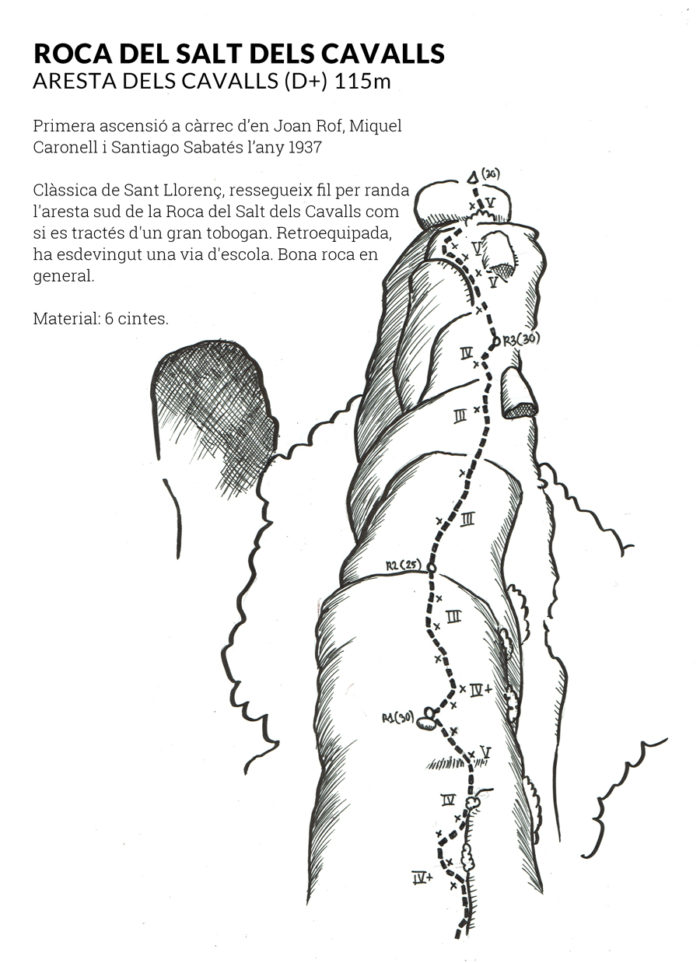 L‘Aresta dels Cavalls pertany a la categoria d’escalades pioneres del País, oberta l’any 1937. L’escalada en si, té aquella bellesa clàssica del que és lògic, enfilant-se aresta amunt com si d’un enorme tobogà es tractés. El colofó el posa el darrer llarg de corda, amb una secció més aèria que li dóna l’ambient que no acaba de tenir la resta de la via. Actualment es troba retroequipada esdevenint una via d’escola ideal per iniciar-se en vies de més d’una tirada.
