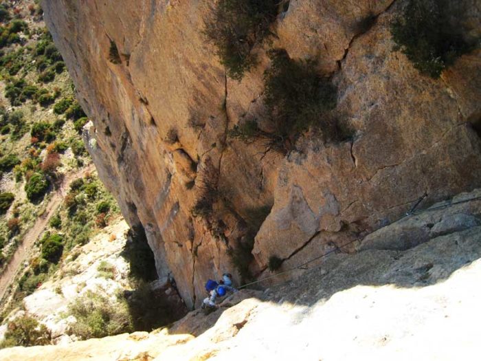 Sortim de la reunió flanquejant a l’esquerra fins trobar el primer parabolt. A partir d’aquest punt anem escalant en diagonal a dreta fins que la paret es posa més vertical. Superem aquest pas, que es troba ben protegit amb dos expansions i entrem a la reunió. 30 metres.