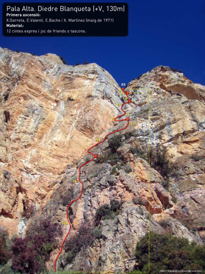 La Pala Alta és un dels punts més elevats de la Noguera. Des del seu cim tenim una fantàstica panoràmica: la Paret d’Aragó, Àger, La paret del Doll, Terradets, Sant Llorenç de Montgai… A banda d’apreciacions paisatgístiques, aquesta paret té una bona quantitat d’itineraris de qualitat. D’entre tots, un dels clàssics és el Diedre Blanqueta, via que puja pel centre de la paret i aprofita el marcat diedre que fa aquesta.