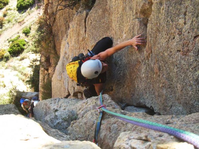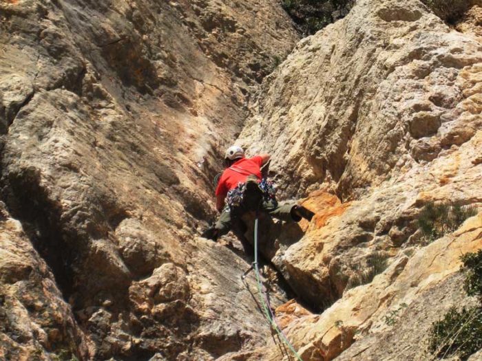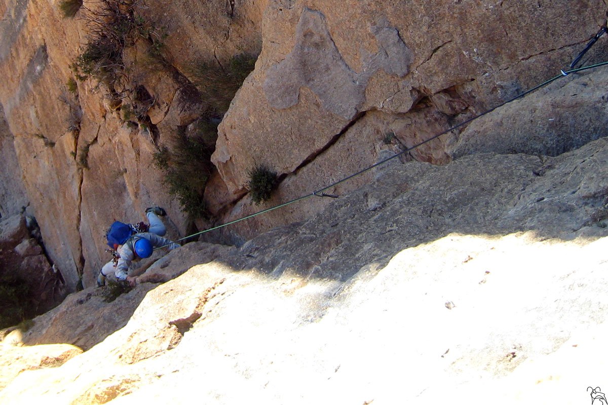 Sortim de la reunió amb un pas tècnic i de seguida ens col·loquem al mig del diedre amb les cames ben obertes per anar a buscar la primera assegurança. Per arribar al següent clau cal un altre pas atlètic sobre la fissura. Un cop arribat a aquest punt el diedre es torna menys exigent i gaudim d’una escalada més relaxada però no per això menys maca. Sortim del diedre per dalt i anem a buscar la r que es troba a la dreta.