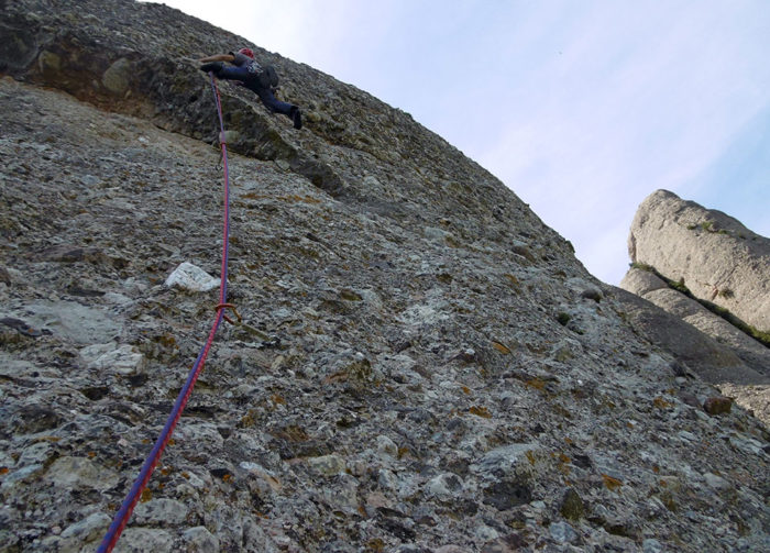 La Petit Gerard és una raresa a Gorros. Amb una primera tirada tècnica i roca millorant a mesura que anem guanyant metres, té un segon llarg preciós, amb un sostret amb cantell seguit d’un mur made in Gorros. El darrer (es pot dividir en dos) ja és el típic camp de patates que ens té acostumats aquesta banda de Montserrat.