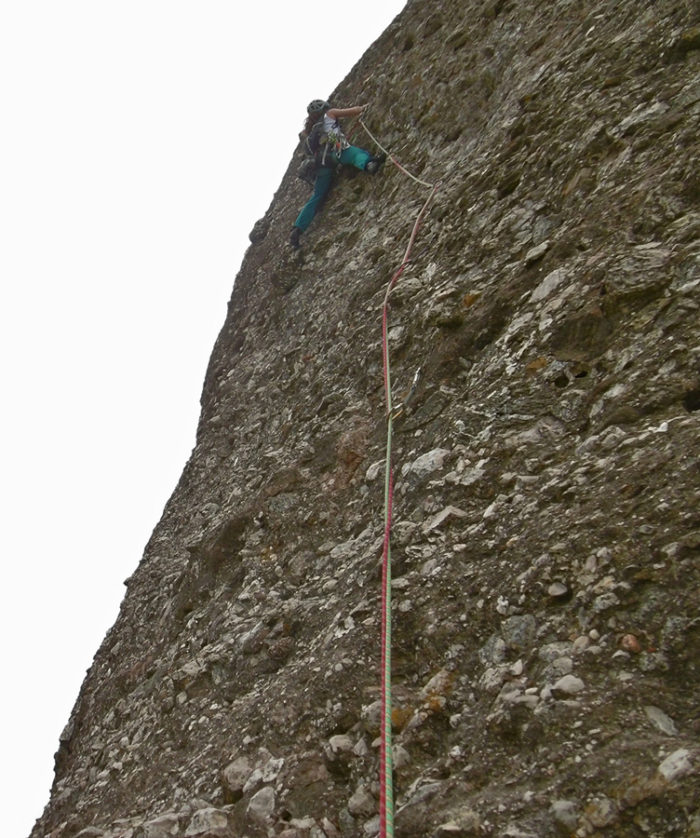 La segona tirada també té un parell de metres de roca trencada però de seguida es torna absolutament fiable. L’inici és potent, amb un desplom continuat que li dóna el grau màxim a la via. A poc a poc la paret deixa de desplomar i escalem uns murs verticals molt bons. Quan el llarg perd definitivament l’empenta trobarem la reunió, a una còmoda banyera.