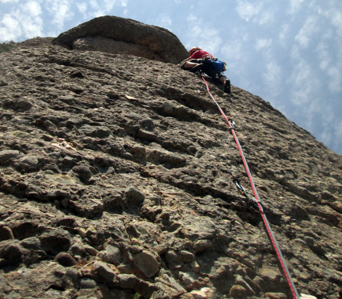 La Directa Americana cerca el camí per enfilar-se al capdamunt de l’Esperó del Dru (res a veure amb el seu homònim Alpí). Ho fa aprofitant unes plaques en general verticals i de gran qualitat.