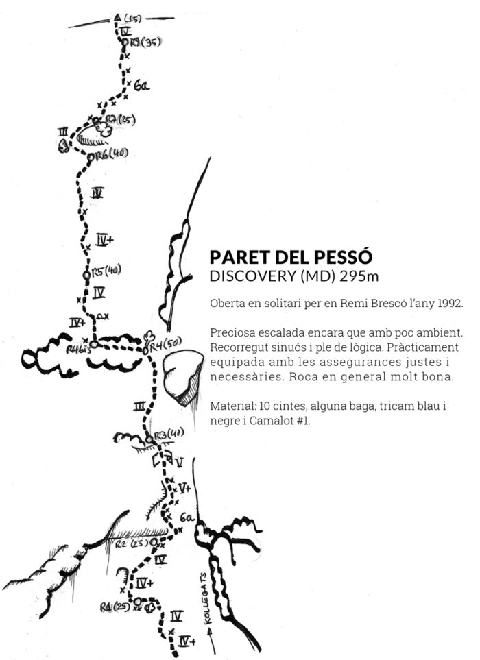 Això és el que passa amb la bonica Discovery, un recorregut carregat amb tot el saber fer d’un dels grans aperturistes del país, que discretament i en solitari s’enfilà per aquest pany de conglomerat excel·lent traçant-hi una línia que només pel seu preciós colofó paga la pena resseguir. Això sí, no hi trobarem una filera de parabolts que ens marquin el camí, malgrat que les assegurances hi són.
