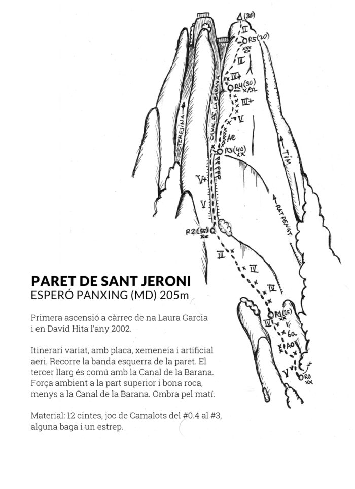 A l’esquerra de l’escut central de la Paret de Sant Jeroni trobem l’Esperó Panxing, un itinerari prou interessant que permet recórrer aquesta banda tant poc transitada.