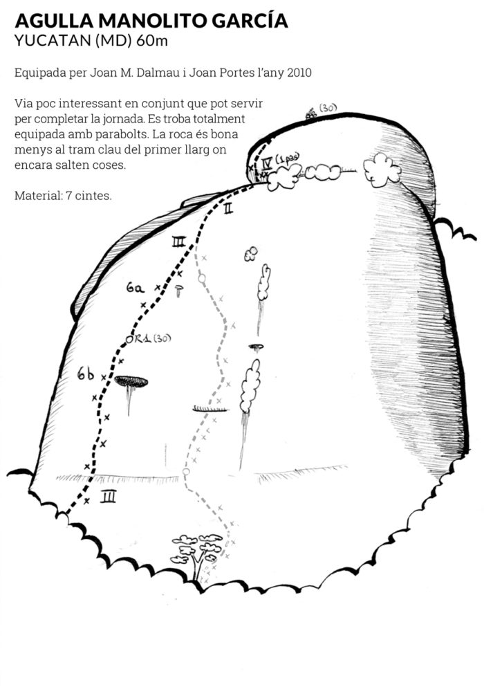 A la banda sud-est de l’agulla hi trobem aquest discret itinerari. Completament equipat, només haurem de menester les cintes exprés.