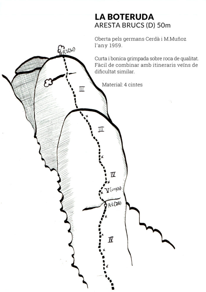 La Boteruda és la tercera Agulla d’aquesta mena de carena en miniatura que conforma juntament amb els Merlets i el Gep Llarg. Com totes elles, i no podia ser d’altre manera, posseeix una deliciosa Aresta Brucs, breu, fàcil però no per això menys interessant. En aquest cas endemés hi acompanya una roca de primera i un equipament que res té a veure a com fou oberta, esdevenint un itinerari recomanable per neòfits.