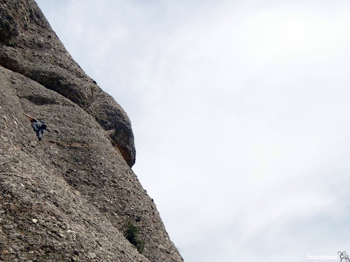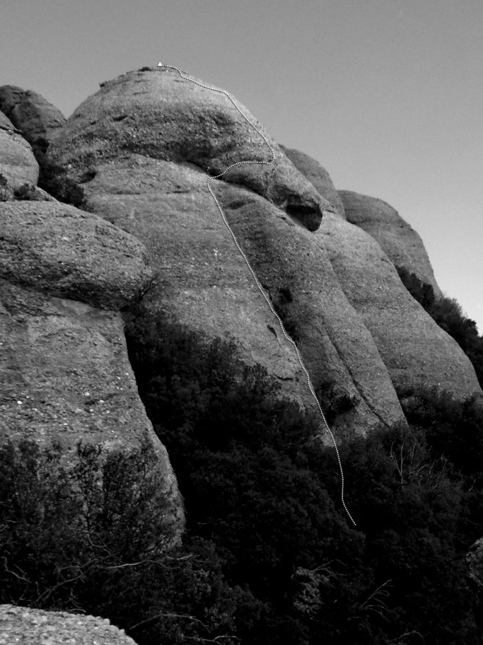 La via va a buscar l’evidentíssim diedre que ressegueix el vessant sud-oest de l’agulla. Malgrat que des del peu de via sembli un rostoll a mida que ens elevem al diedre cada cop es va fent més perfecte. Un cop passats els arbres l’assegurament es fa més complicat donat que no hi ha una fissura franca, tot i això hi ha un parell de bons ‘clavaderos’. La segona tirada comença amb dos passos d’A0 i una sortida en lliure prou curiosa, en flanqueig a dretes per anar a buscar el centre de l’aresta. La roca en conjunt és bona, tot i alguna crosta que pot saltar.