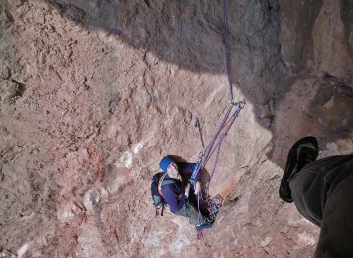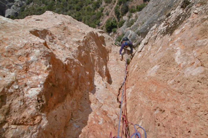 Marxem cap a la dreta per anar a cercar un corriol poc definit que va a petar a una instal·lació de ràpel. Fem un ràpel de 45 metres que ens deixa al costat del camí.