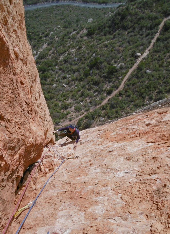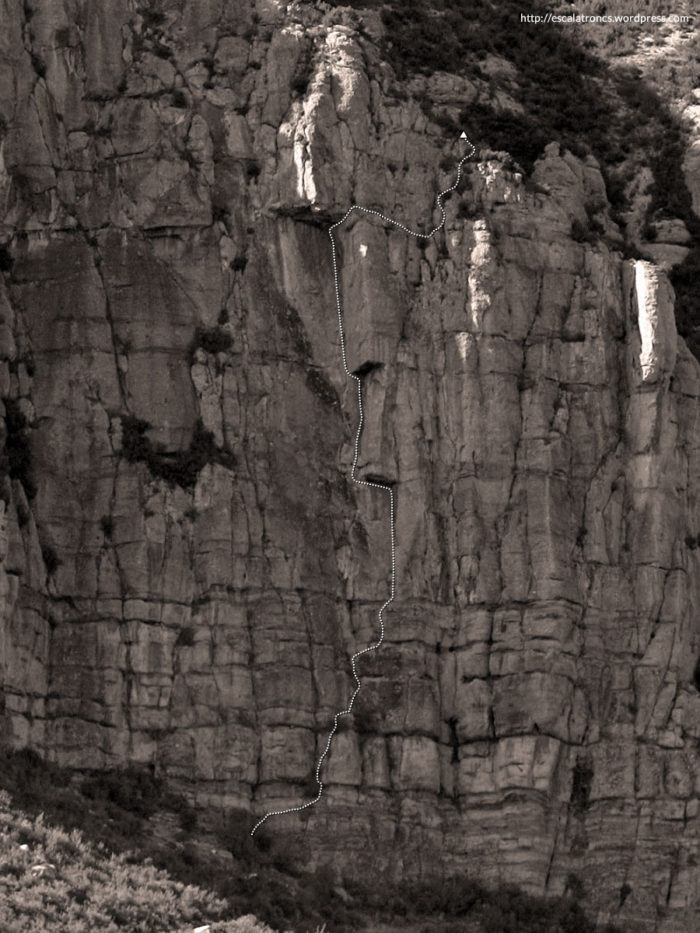 Via de fissures a equipar. Els primers metres són molt desagradables, sobre roca escamosa, terra i matolls, peatge a pagar per poder gaudir de les fissures centrals. A la meitat del primer llarg hi ha una reunió. La segona i la tercera tirada són dos llargs de fissura sensacionals, mantinguts en V amb algun pas més difícil i absolutament agraïts a l’hora d’equipar. El quart supera un sostre perfectament fissurat en escalada artificial a equipar (un universal emplaçat). No obstant els friends mitjans entren a caldo. Al final de la tirada trobarem un parell d’espits. El darrer llarg és molt indefinit. Toca baixar una mica per anar a buscar una mena de diedres fàcils però trencats; té pinta que es pugui sortir directe amunt des de la reunió quedant una tirada molt més elegant.