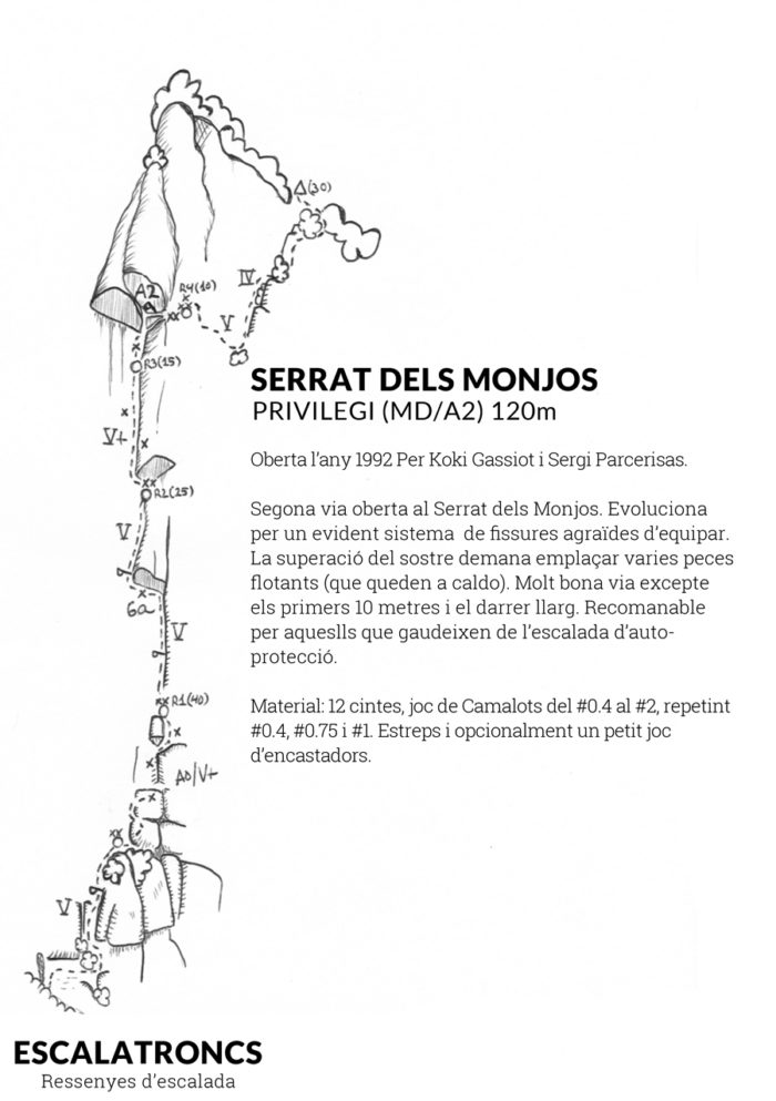 D‘una lògica aclaparadora la Privilegi fou la segona via oberta al Serrat dels Monjos. La seva geometria fissurada demana a crits ser escalada i quan ens hi posem no decepciona.
